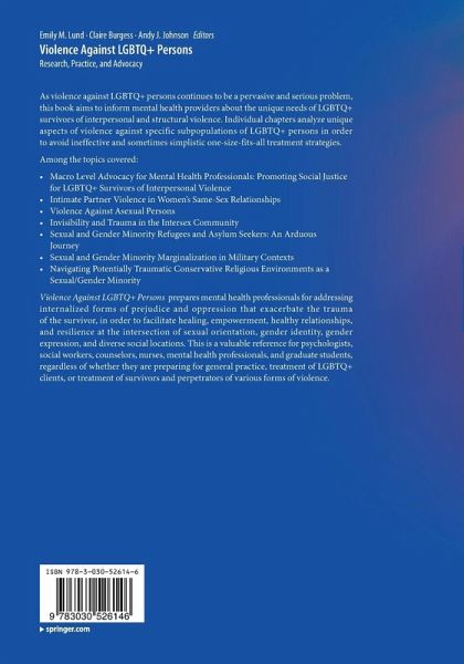 "Violence Against LGBTQ+ Persons: Research, Practice, and Advocacy offers a comprehensive overview of the serious problem of violence LGTBQ+ individuals are still facing. ... also provide affirmative resources for LGBTQ+ individuals seeking therapy as well as for those seaking spiritual and religious support. ... Clinicians and researchers must continue to listen to LGBTQ+ persons tell their stories and fight for their right to equality and safety." (Shay Caramiello, Division 44, apadivisions.org, April, 2021)
