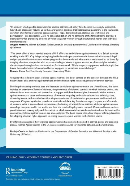 "This book offers a much needed analysis of U.S. efforts to end violence against women. As a British scientist working in the U.S., Coy brings an inspiring insider/outsider perspective to the issues and with unusual depth and perspective illuminates areas where progress has been made and where much more needs to be done. By merging a feminist perspective with an understanding of violence against women as a human rights violation, she develops clear-sighted recommendations for future work. This is a superb engagement with the topic that leaves the reader better informed and better equipped to participate in social change."