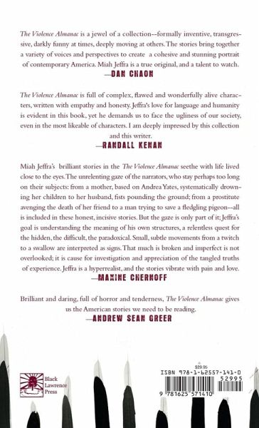 In THE VIOLENCE ALMANAC, Miah Jeffra complicates the boundaries between culture and nature, fiction and true-crime, desire and pain. In this powerful fiction debut, Jeffra takes us through the California landscape to map the various ways that violence emerges, terrorizes and shapes our most familiar social structures. An ostracized child yearns to be the hero for a rural community threatened by an escaped penitentiary inmate. An ambitious young writer receives mysterious film clips that thrust her and her boyfriend into a spiral of grief. A sex worker attempts to move on after her best friend is murdered by a john. A seismologist struggles to control his rage over a breakup that summons his internal racism. A biographer seeks to capture the truth of Andrea Yates, the Texas mother who drowned her five children. Familiar and real, ripped from headlines yet a fiction all its own, THE VIOLENCE ALMANAC vacillates between visceral horror and heartbreaking humanity. With a broad array of voices, these stories paint a portrait of the vastly diverse, complicated, hyper-mediated state of California and the state of ourselves, and blurs the line between safety and danger, love and obsession, victim and agent of violence.