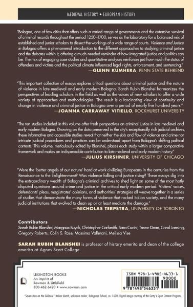 Introduction, Sarah Rubin Blanshei Abbreviations Part I: Criminal Justice: Procedures and Practices Chapter 1: Vendetta, Violence, and Police Power in Thirteenth-Century Bologna, Gregory Roberts Chapter 2: Criminal Court Procedure in Late Medieval Bologna: Cultural and Social Contexts, Massimo Vallerani Chapter 3: Bolognese Criminal Justice: From Medieval Commune to Renaissance Signoria, Sarah Rubin Blanshei Chapter 4: Investigating Homicide: Bologna in the 1450s, Trevor Dean Chapter 5: Violence and the Centralization of Criminal Justice in Early Modern Bologna, Colin S. Rose Part II: Typologies of Violence Chapter 6: Contra Ribaldos Proditores: From Factional Conflict to Political Crime in Renaissance Bologna, Sara Cucini Chapter 7: The "Enormous and Horrendous" Crime of Poisoning: Bologna, ca. 1300-1700, Margaux Buyck Chapter 8: Accusations of Rape in Thirteenth-Century Bologna, Carol Lansing Chapter 9: To the Podestà or the Inquisitor? Adjudicating Violence against God in Bologna, 1250-1450, Me