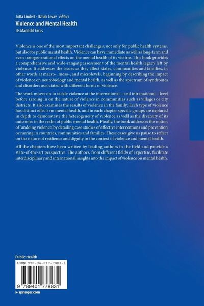 Violence is one of the most important challenges, not only for public health systems, but also for public mental health. Violence can have immediate as well as long-term and even transgenerational effects on the mental health of its victims. This book provides a comprehensive and wide-ranging assessment of the mental health legacy left by violence. It addresses the issues as they affect states, communities and families, in other words at macro-, meso- and microlevels, beginning by describing the impact of violence on neurobiology and mental health, as well as the spectrum of syndromes and disorders associated with different forms of violence.