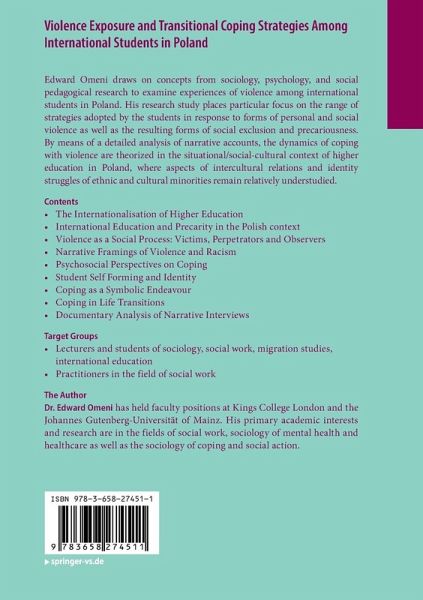 Edward Omeni draws on concepts from sociology, psychology, and social pedagogical research to examine experiences of violence among international students in Poland. His research study places particular focus on the range of strategies adopted by the students in response to forms of personal and social violence as well as the resulting forms of social exclusion and precariousness. By means of a detailed analysis of narrative accounts, the dynamics of coping with violence are theorized in the situational/social-cultural context of higher education in Poland, where aspects of intercultural relations and identity struggles of ethnic and cultural minorities remain relatively understudied.