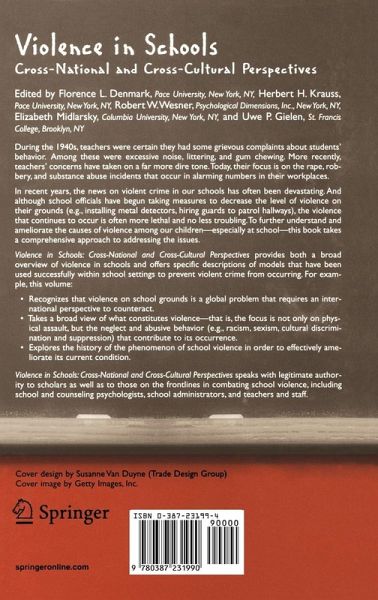 Violence in Schools: Cross-National and Cross-Cultural Perspectives speaks with legitimate authority to scholars as well as to those on the frontlines in combating school violence, including school and counseling psychologists, schooladministrators, teachers and staff as well as concerned parents.