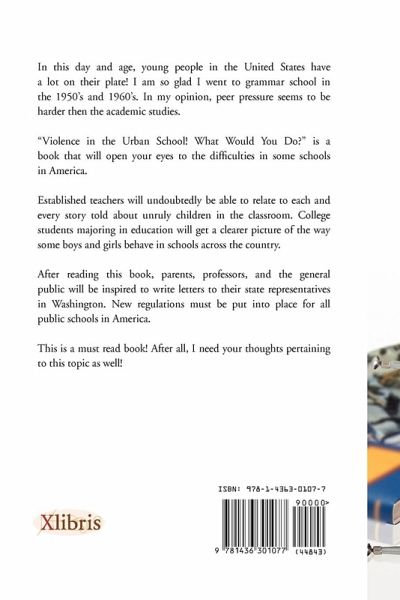 In this day and age, young people in the United States have alot on their plate! I am so glad I went to grammar school in the 1950's and 1960's. In my opinion, peer pressure seems to be harder then the academic studies. "Violence in the Urban School! What Would You Do?" is a book that will open your eyes to the difficulties in some schools in America. Established teachers will undoubted be able to relate to each and every story told about unruly children in the classroom. College students majoring in education will get a clearer picture of the way some boys and girls behave in schools across the country. After reading this book, parents, professors, and the general public will be inspired to write letters to their state representatives in Washington. New regulations must be put into place for all public schools in America. This is a must read book! After all, I need your thoughts pertaining to this topic as well!