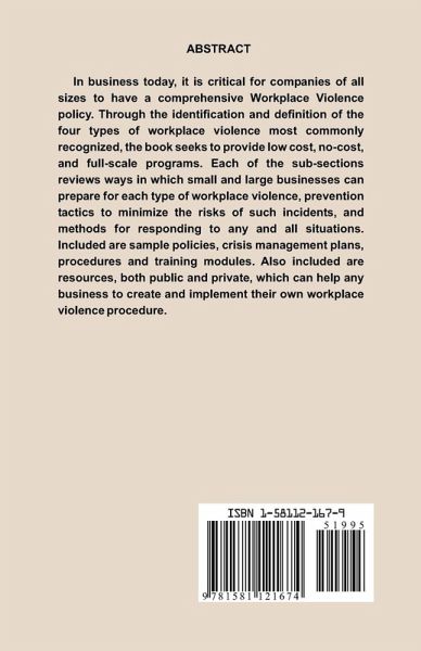 In business today, it is critical for companies of all sizes to have a comprehensive Workplace Violence policy. Through the identification and definition of the four types of workplace violence most commonly recognized, the book seeks to provide low cost, no-cost, and full-scale programs. Each of the sub-sections reviews ways in which small and large businesses can prepare for each type of workplace violence, prevention tactics to minimize the risks of such incidents, and methods for responding to any and all situations. Included are sample policies, crisis management plans, procedures and training modules. Also included are resources, both public and private, which can help any business to create and implement their own workplace violence procedure.