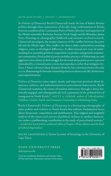 In Violence of Democracy Ruchi Chaturvedi tracks the rise of India's divisive politics through close examination of decades-long confrontations in Kerala between members of the Communist Party of India (Marxist) and supporters of the Hindu nationalist Rashtriya Swayam Sevak Sangh and the Bharatiya Janata Party. Drawing on ethnographic fieldwork and extensive archival research, Chaturvedi investigates the unique character of the conflict between the party left and the Hindu right. This conflict, she shows, defies explanations centering religious, caste, or ideological differences. It offers instead new ways of understanding how quotidian political competition can produce antagonistic majoritarian communities. Rival political parties mobilize practices of disbursing care and aggressive masculinity in their struggle for electoral and popular power, a process intensified by a criminal justice system that reproduces rather than mitigating violence. Chaturvedi traces these dynamics from the late colonial period to the early 2000s, illuminating the broader relationships between democratic life, divisiveness, and majoritarianism.