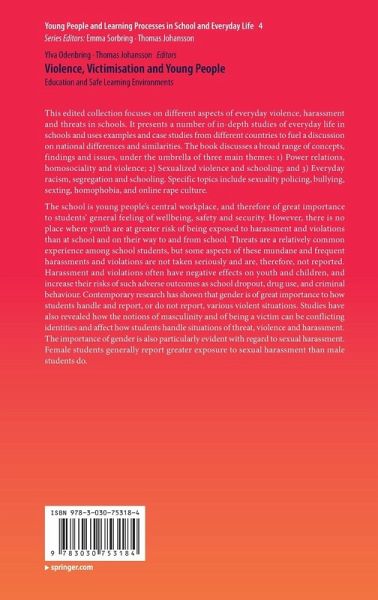 Chapter 1. Introduction (Ylva Odenbring and Thomas Johansson).- Part I: Power relations, Homosociality and Violence.- Chapter 2. Revisiting lower secondary schools in the 1990s: Reflections on and interpretations of sexual and gender-based harassment.- Chapter 3. Gender and Sexuality Policing: The violence that 'doesn't count'.- Chapter 4.The modern passage from boyhood to manhood and its relationship to bullying and harassment.- Chapter 5. Rumbling and tumbling in school: Jokes, masculinity and homosocial relations.- Chapter 6. What happens when young men hurt? Exploring young men's experiences of relationship dissolution in educational contexts.- Part II: Sexualized violence and schooling.- Chapter 7. Young people's experiences of sexting and online sexual victimization.- Chapter 8. Unsolicited Dick Pics: Online Sexual Harassment, Gendered Relations and Schooling.- Chapter 9. Resisting Rape Culture online and at school: The pedagogy of Digital Defence and Feminist Activism Lessons.- Chapter 10. Heteronormative violence in schools: focus on homophobia, transphobia and the experiences of trans and non-heterosexual youth.- Chapter 11. Epistemic Violence towards LGBTQ students in Icelandic high schools: Challenges and opportunities for transforming schools.- Part III: Everyday racism, segregation and schooling.- Chapter 12. 'Go home to your country!' - Everyday racism in a rural lower secondary school.- Chapter 13. "I'll have security, I'll go to school, I'll live my life" - Unaccompanied children on school, education and racism.- Chapter 14. 'We are the bosses here': Schooling, segregation and brotherhood.