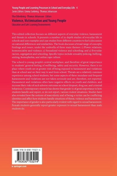 Chapter 1. Introduction (Ylva Odenbring and Thomas Johansson).- Part I: Power relations, Homosociality and Violence.- Chapter 2. Revisiting lower secondary schools in the 1990s: Reflections on and interpretations of sexual and gender-based harassment.- Chapter 3. Gender and Sexuality Policing: The violence that 'doesn't count'.- Chapter 4.The modern passage from boyhood to manhood and its relationship to bullying and harassment.- Chapter 5. Rumbling and tumbling in school: Jokes, masculinity and homosocial relations.- Chapter 6. What happens when young men hurt? Exploring young men's experiences of relationship dissolution in educational contexts.- Part II: Sexualized violence and schooling.- Chapter 7. Young people's experiences of sexting and online sexual victimization.- Chapter 8. Unsolicited Dick Pics: Online Sexual Harassment, Gendered Relations and Schooling.- Chapter 9. Resisting Rape Culture online and at school: The pedagogy of Digital Defence and Feminist Activism Lessons.- Chapter 10. Heteronormative violence in schools: focus on homophobia, transphobia and the experiences of trans and non-heterosexual youth.- Chapter 11. Epistemic Violence towards LGBTQ students in Icelandic high schools: Challenges and opportunities for transforming schools.- Part III: Everyday racism, segregation and schooling.- Chapter 12. 'Go home to your country!' - Everyday racism in a rural lower secondary school.- Chapter 13. "I'll have security, I'll go to school, I'll live my life" - Unaccompanied children on school, education and racism.- Chapter 14. 'We are the bosses here': Schooling, segregation and brotherhood.