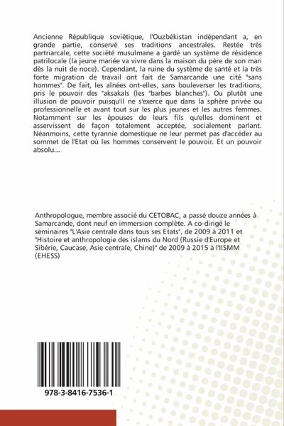 Ancienne République soviétique, l'Ouzbékistan indépendant a, en grande partie, conservé ses traditions ancestrales. Restée très partriarcale, cette société musulmane a gardé un système de résidence patrilocale (la jeune mariée va vivre dans la maison du père de son mari dès la nuit de noce). Cependant, la ruine du système de santé et la très forte migration de travail ont fait de Samarcande une cité "sans hommes". De fait, les aînées ont-elles, sans bouleverser les traditions, pris le pouvoir des "aksakals (les "barbes blanches"). Ou plutôt une illusion de pouvoir puisqu'il ne s'exerce que…mehr
