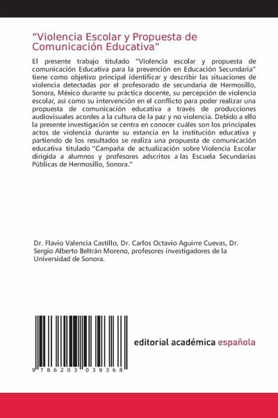 El presente trabajo titulado "Violencia escolar y propuesta de comunicación Educativa para la prevención en Educación Secundaria" tiene como objetivo principal identificar y describir las situaciones de violencia detectadas por el profesorado de secundaria de Hermosillo, Sonora, México durante su práctica docente, su percepción de violencia escolar, así como su intervención en el conflicto para poder realizar una propuesta de comunicación educativa a través de producciones audiovisuales acordes a la cultura de la paz y no violencia. Debido a ello la presente investigación se centra en conocer cuáles son los principales actos de violencia durante su estancia en la institución educativa y partiendo de los resultados se realiza una propuesta de comunicación educativa titulado "Campaña de actualización sobre Violencia Escolar dirigida a alumnos y profesores adscritos a las Escuela Secundarias Públicas de Hermosillo, Sonora."
