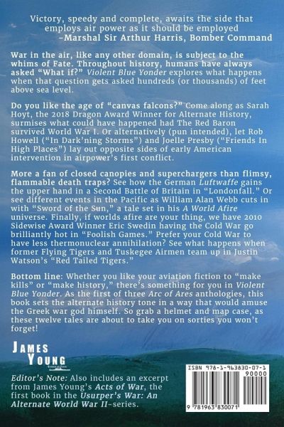 Victory, speedy and complete, awaits the side that employs air power as it should be employed-Marshal Sir Arthur Harris, Bomber Command War in the air, like any other domain, is subject to the whims of Fate. Throughout history, humans have always asked "What if?" Violent Blue Yonder explores what happens when that question gets asked hundreds (or thousands) of feet above sea level. Do you like the age of "canvas falcons?" Come along as Sarah Hoyt, the 2018 Dragon Award Winner for Alternate History, surmises what could have happened had The Red Baron survived World War I. Or alternatively (pun intended), let Rob Howell ("In Dark'ning Storms") and Joelle Presby ("Friends In High Places") lay out opposite sides of early American intervention in airpower's first conflict. More a fan of closed canopies and superchargers than flimsy, flammable death traps? See how the German Luftwaffe gains the upper hand in a Second Battle of Britain in "Londonfall." Or see different events in the Pacific as William Alan Webb cuts in with "Sword of the Sun," a tale set in his A World Afire universe. Finally, if worlds afire are your thing, we have 2010 Sidewise Award Winner Eric Swedin having the Cold War go brilliantly hot in "Foolish Games." Prefer your Cold War to have less thermonuclear annihilation? See what happens when former Flying Tigers and Tuskegee Airmen team up in Justin Watson's "Red Tailed Tigers." Bottom line: Whether you like your aviation fiction to "make kills" or "make history," there's something for you in Violent Blue Yonder. As the first of three Arc of Ares anthologies, this book sets the alternate history tone in a way that would amuse the Greek war god himself. So grab a helmet and map case, as these twelve tales are about to take you on sorties you won't forget! Editor's Note: Also includes an excerpt from James Young's Acts of War, the first book in the Usurper's War: An Alternate World War II-series.