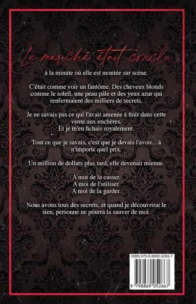 Le marché était conclu à la minute où elle est montée sur scène. C'était comme voir un fantôme. Des cheveux blonds comme le soleil, une peau pâle et des yeux azur qui renfermaient des milliers de secrets. Je ne savais pas ce qui l'avait amenée à finir dans cette vente aux enchères. Et je m'en fichais royalement. Tout ce que je savais, c'est que je devais l'avoir... à n'importe quel prix. Un million de dollars plus tard, elle devenait mienne. A moi de la casser. A moi de l'utiliser. A moi de la garder. Nous avons tous des secrets, et quand je découvrirai le sien, personne ne pourra la sauver de moi. Il s'agit d'un roman de plus de 100 000 mots. Il aborde des sujets sérieux, y compris la violence et des scènes à caractère sexuel. Bien entendu, il n'y a pas d'infidélité et l'histoire se termine en beauté.
