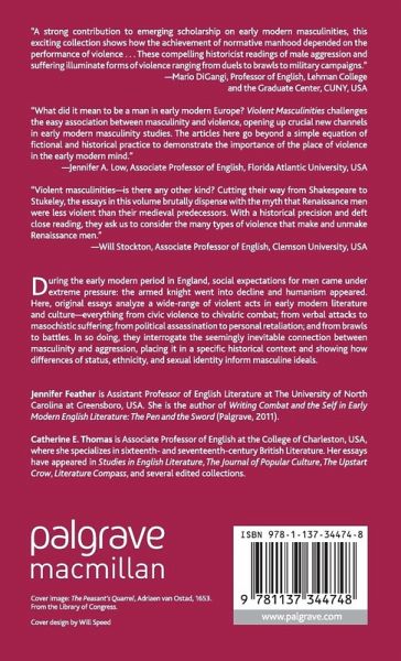 "A strong contribution to emerging scholarship on early modern masculinities, this exciting collection shows how the achievement of normative manhood depended on the performance of violence. In the turbulent social world of early modern Europe, these essays suggest male aggression signified differently according to distinctions of age, status, and sexuality. These compelling historicist readings of male aggression and suffering illuminate forms of violence ranging from duels to brawls to military campaigns." - Mario DiGangi, Professor of English, Lehman College and the Graduate Center, CUNY, USA