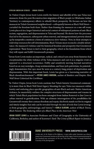 In Violent Utopia Jovan Scott Lewis retells the history and afterlife of the 1921 Tulsa race massacre, from the post-Reconstruction migration of Black people to Oklahoma Indian Territory to contemporary efforts to rebuild Black prosperity. He focuses on how the massacre in Tulsa's Greenwood neighborhood-colloquially known as Black Wall Street-curtailed the freedom built there. Rather than framing the massacre as a one-off event, Lewis places it in a larger historical and social context of widespread patterns of anti-Black racism, segregation, and dispossession in Tulsa and beyond. He shows how the processes that led to the massacre, subsequent urban renewal, and intergenerational poverty shored up by nonprofits constitute a form of continuous slow violence. Now, in their attempts to redevelop resources for self-determination, Black Tulsans must reconcile a double inheritance: the massacre's violence and the historical freedom and prosperity that Greenwood represented. Their future is tied to their geography, which is the foundation from which they will repair and fulfill Greenwood's promise.