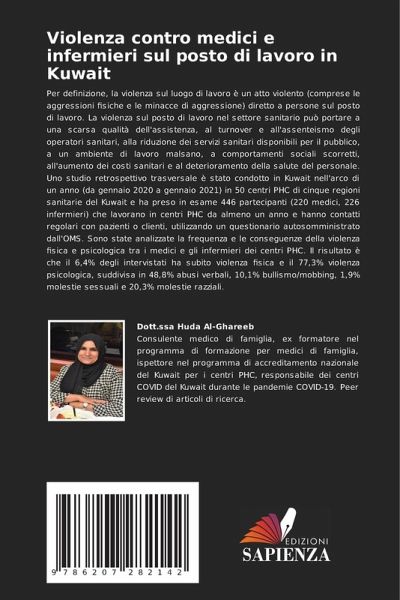 Per definizione, la violenza sul luogo di lavoro è un atto violento (comprese le aggressioni fisiche e le minacce di aggressione) diretto a persone sul posto di lavoro. La violenza sul posto di lavoro nel settore sanitario può portare a una scarsa qualità dell'assistenza, al turnover e all'assenteismo degli operatori sanitari, alla riduzione dei servizi sanitari disponibili per il pubblico, a un ambiente di lavoro malsano, a comportamenti sociali scorretti, all'aumento dei costi sanitari e al deterioramento della salute del personale. Uno studio retrospettivo trasversale è stato condotto in Kuwait nell'arco di un anno (da gennaio 2020 a gennaio 2021) in 50 centri PHC di cinque regioni sanitarie del Kuwait e ha preso in esame 446 partecipanti (220 medici, 226 infermieri) che lavorano in centri PHC da almeno un anno e hanno contatti regolari con pazienti o clienti, utilizzando un questionario autosomministrato dall'OMS. Sono state analizzate la frequenza e le conseguenze della violenza fisica e psicologica tra i medici e gli infermieri dei centri PHC. Il risultato è che il 6,4% degli intervistati ha subito violenza fisica e il 77,3% violenza psicologica, suddivisa in 48,8% abusi verbali, 10,1% bullismo/mobbing, 1,9% molestie sessuali e 20,3% molestie razziali.