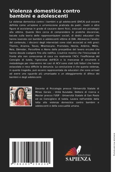 La violenza domestica contro i bambini e gli adolescenti (DVCA) può essere definita come un'azione o un'omissione praticata da padri, madri o altre figure di assistenza in grado di causare danni fisici, sessuali e/o psicologici alla vittima. Questo libro cerca di comprendere le pratiche discorsive, basate sulla teoria delle rappresentazioni sociali, di dodici educatori che hanno lavorato con bambini e adolescenti vittime di DVA. Attraverso l'analisi del contenuto, i discorsi degli intervistati sono stati associati ai miti greci: Themis, Arianna, Teseo, Mnemosyne, Prometeo, Hestia, Artémis, Métis, Reia, Démeter, Persefóne e Atena dalla prospettiva del lavoro erculeo che hanno dovuto svolgere fino alla notifica. L'autrice mostra che l'insicurezza di fronte alla non conoscenza di cosa sia realmente l'ACV, l'inefficienza del Consiglio di tutela, l'ignoranza dell'ECA e la mancanza di strumenti e metodologie per intervenire nei casi di ACV sono stati tutti fattori che hanno ostacolato e reso difficile la denuncia. La conclusione è che questa violenza, in quanto tragedia, può essere rappresentata da educatori che sono arrivati ad avere uno sguardo più umanizzato e un atteggiamento di difesa dei bambini e degli adolescenti.