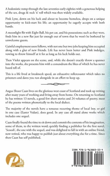 A hedonistic romp through the late seventies-early eighties with a generous helping of the sex, drugs & rock 'n' roll which was then widely available. Pink Lynt, down on his luck and about to become homeless, drops on a unique opportunity to kick-start his life; an opportunity he eagerly accepts with both hands. A moonlight flit with Eight Ball, his pet cat, and his possessions; such as they were, finds him in a new flat just far enough out of town that he won't be bothered by unwelcome guests. Gainful employment soon follows, with not one but two jobs keeping him occupied along with a glut of new friends. Life has never been better and Pink indulges, vowing to throw himself at it for as long as his luck holds out. Then Violet appears on the scene, and, while she doesn't exactly throw a spanner into the works, she presents him with a conundrum the likes of which he has never heard tell of. This is a life lived at breakneck speed, an exhaustive rollercoaster which takes no prisoners and dares you run alongside in an effort to keep up.