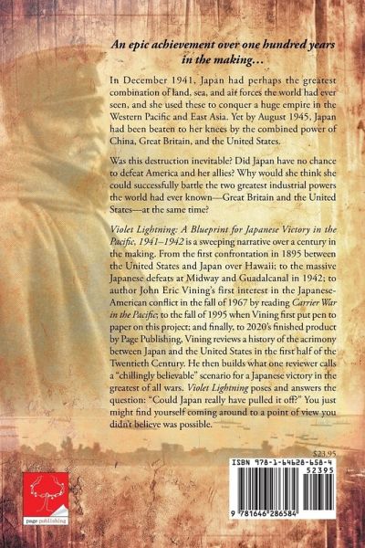 An epic achievement nearly one hundred years in the making... In December 1941, Japan had perhaps the greatest combination of land, sea, and air forces the world had ever seen, and she used these to conquer a huge empire in the Western Pacific and East Asia. Yet by August 1945, Japan had been beaten to her knees by the combined power of China, Great Britain, and the United States. Was this destruction inevitable? Did Japan have no chance to defeat America and her allies? Why would she think she could successfully battle the two greatest industrial powers the world had ever known-Great Britain and the United States-at the same time? Violet Lightning: A Blueprint for Japanese Victory in the Pacific, 1941-1942 is a sweeping narrative nearly a century in the making. From the first confrontation in 1895 between the United States and Japan over Hawaii; to the massive Japanese defeats at Midway and Guadalcanal in 1942; to author John Eric Vining's first interest in the Japanese-American conflict in the fall of 1967 by reading Carrier War in the Pacific; to the fall of 1995 when Vining first put pen to paper on this project; and finally, to 2020's finished product by Page Publishing, Vining reviews a history of the acrimony between Japan and the United States in the first half of the Twentieth Century. He then builds what one reviewer calls a "chillingly believable" scenario for a Japanese victory in the greatest of all wars. Violet Lightning poses and answers the question: "Could Japan really have pulled it off?" You just might find yourself coming around to a point of view you didn't believe was possible.