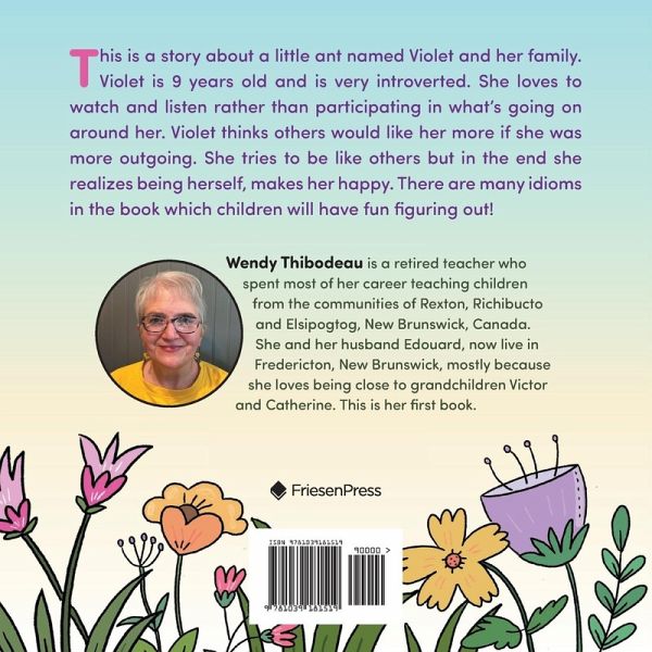 This is a story about a little ant named Violet and her family. Violet is around 9 years old and is very introverted. She loves to watch and listen rather than participating in what's going on around her. Violet thinks others would like her more if she was more outgoing. She tries to be like others but in the end she realizes being herself, makes her happy. There are many idioms in the book which children will have fun figuring out!