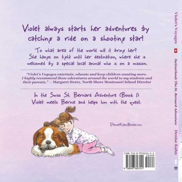 Violet's Voyages is a series of books about a young girl who travels to different countries around the world by catching a ride on a shooting star! Once there she meets a special local animal who is on some sort of mission. Violet helps with the animal's quest.In the Swiss St. Bernard Adventure (Book 1) Violet meets Bernie and helps him rescue a skier.