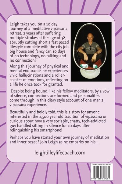 Leigh takes you on a 10 day journey of a meditative vipassana retreat. 2 years after suffering multiple strokes at the age of 38, abruptly cutting short a fast paced lifestyle complete with the city job, big house and fancy car. 10 days of no technology, no talking and no connection! Along this journey of physical and mental endurance he experiences vivid hallucinations and a roller-coaster of emotions, reflecting on a life he once took for granted. Despite being bound, like his fellow meditators, by a vow of silence, connections are formed and personalities come through in this diary style account of one man's vipassana experience.¿Beautifully and boldly told, this is a story for anyone interested in the 2,500 year old tradition of vipassana or curious about how a very sociable, chatty, tech-addicted guy handled sitting in silence for 10 days after relinquishing his smartphone!¿Perhaps you have started your own journey of meditation and inner peace? Join Leigh as he embarks on his...