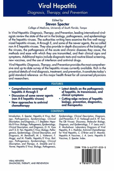 "...a cadre of international investigators thoroughly review all aspects of these human pathogens, including available therapeutic and prevention strategies...These well-organized chapters provide an in-depth account of the current knowledge of each of these viral agents including their basic virology, diagnosis, pathogenesis, epidemiology, and natural history, as well as the clinical features of the diseases they cause...the book is well-written and organized...[it] crystallizes in one volume a remarkable amount of information. It should be enjoyed by primary care practitioners, as well as gastroenterologists, hepatologists, [and] virologists." -Antiviral Research "This clearly written and readable review of viral hepatitis provides useful information for family physicians interested in this protean disorder...Coverage of viral hepatitis is thorough and complete...Good-sized print and pointed chapter subheadings make the book easy to peruse or read cover to cover. Each chapter is divided into sections, allowing the reader to quickly access desired information...The clear writing style and useful content provide an effective review of biochemistry and genetics that is suitable for family physicians. The illustrations consist mainly of table and graphics offering helpful clinical information and providing clear diagnostic and prognostic clues... Dr. Specter has put together an up-to-date summary of all that is known about viral hepatitis in a highly readable book...This book is written by clinicians and researchers but clearly aimed at clinicians. It successfully provides us with distinct guidelines for thinking about viral hepatitis and its management." -American Family Physician "...quite an improvement over similar texts published to date in this area...The text has a number of attractive features....the writing is clear and concise. Overlap, despite the multi-authored format and chapter development, has been kept to a minimum. Another positive feature is the depth with which the majority of topics are dealt. This is particularly evident in the sections dealing with the viruses themselves and their replicative cycles. For example, interested readers will be pleased to find descriptions of the hairpin structures that might participate in regulation of hepatitis C virus genome expression and the precise positions of large stem loops, which are thought to represent internal ribosomal entry sites...In summary, this textbook deals with an important and timely subject. For the virologist, the answer to many if not all questions dealing with hepatotrophic viruses can be found within its pages...a recommended purchase for virologists, hepatologists and infectious disease specialists." -Can J Infect Dis "The chapter on hepatitis A is comprehensive...Laboratory diagnosis was clearly set out with no omissions...I found the chapter on anti viral therapy particularly helpful in its concise coverage of all appropriate therapies...this is a very useful book for clinical virologists, hepatologists, scientists researching any of the hepatitis viruses and epidemiologists with an interest in this field." -Clinical Chemistry and Laboratory Medicine "Clinical chemists and other laboratory professionals, physicians, educators, and scientists needing an update on viral hepatitis should find this book a useful, detailed, and readily accessible source of information all of the major hepatitis viruses." - Clinical Chemistry "The general style of the book is comfortable and easy to read. It would be a useful addition to the book collections of gastroenterologists and for medical students with an interest in hepatology." -Microbiology Today