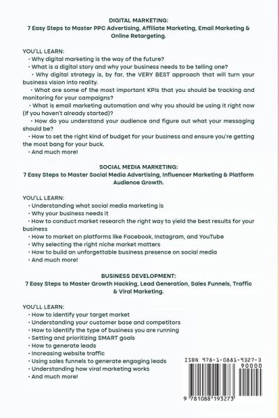 Viral Marketing - 3 Manuscripts in 1 Book, Including: Digital Marketing, Social Media Marketing and Business Development. 1) DIGITAL MARKETING: 7 Easy Steps to Master PPC Advertising, Affiliate Marketing, Email Marketing & Online Retargeting. YOU'LL LEARN:Why digital marketing is the way of the future? What is a digital story and why your business needs to be telling one? Why digital strategy is, by far, the VERY BEST approach that will turn your business vision into reality. What are some of the most important KPIs that you should be tracking and monitoring for your campaigns? What is email marketing automation and why you should be using it right now (if you haven't already started)? How do you understand your audience and figure out what your messaging should be? How to set the right kind of budget for your business and ensure you're getting the most bang for your buck. And much more! 2) SOCIAL MEDIA MARKETING: 7 Easy Steps to Master Social Media Advertising, Influencer Marketing & Platform Audience Growth. YOU'LL LEARN:Understanding what social media marketing is Why your business needs it How to conduct market research the right way to yield the best results for your business How to market on platforms like Facebook, Instagram, and YouTube Why selecting the right niche market matters How to build an unforgettable business presence on social media And much more! 3) BUSINESS DEVELOPMENT: 7 Easy Steps to Master Growth Hacking, Lead Generation, Sales Funnels, Traffic & Viral Marketing. YOU'LL LEARN: · How to identify your target market · Understanding your customer base and competitors · How to identify the type of business you are running · Setting and prioritizing SMART goals · How to generate leads · Increasing website traffic · Using sales funnels to generate engaging leads · Understanding how viral marketing works · And much more!