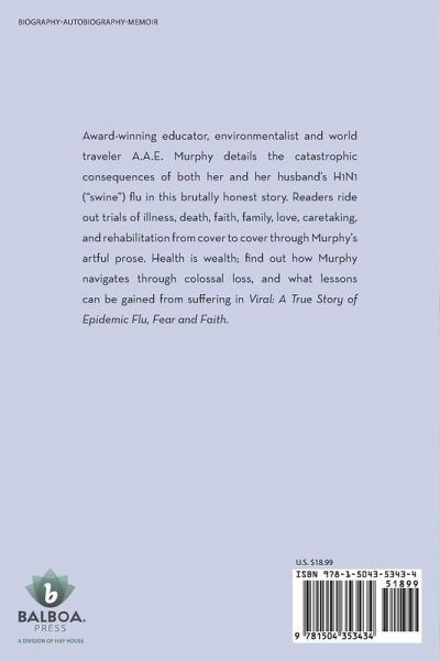 Award-winning educator, environmentalist and world traveler A.A.E. Murphy details the catastrophic consequences of both her and her husband's H1N1 ("swine") flu in this brutally honest story. Readers ride out trials of illness, death, faith, family, love, caretaking, and rehabilitation from cover to cover through Murphy's artful prose. Health is wealth; find out how Murphy navigates through colossal loss, and what lessons can be gained from suffering in Viral: A True Story of Epidemic Flu, Fear and Faith.
