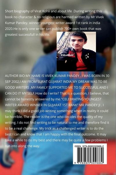 Short biography of Virat Kohli and about life.During writing this book no character & no religious are harmed written by Mr Vivek Kumar Pandey. winner youngest writer award 1st rank in india 2020.He is only one writer can publish 700+ own book that was greatest successfull in his life .