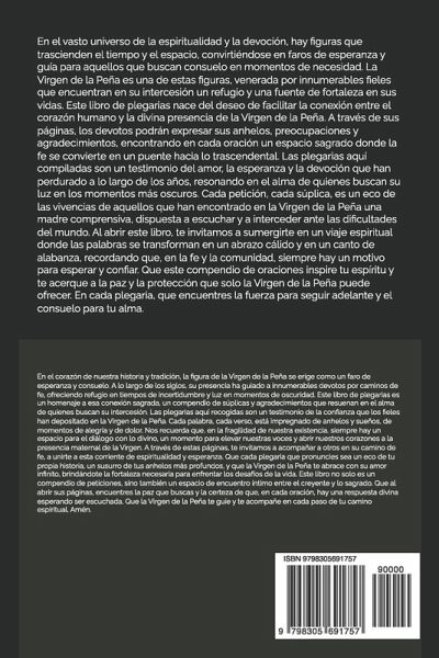 TABLA DE CONTENIDO 1. INTRODUCCION 2. PROLOGO 3. RECOMENDACIÓN 4. PLEGARIAS DE PETICIONES Y CRECIMIENTO ESPIRITUAL INTRODUCCION En el vasto universo de la espiritualidad y la devoción, hay figuras que trascienden el tiempo y el espacio, convirtiéndose en faros de esperanza y guía para aquellos que buscan consuelo en momentos de necesidad. La Virgen de la Peña es una de estas figuras, venerada por innumerables fieles que encuentran en su intercesión un refugio y una fuente de fortaleza en sus vidas. Este libro de plegarias nace del deseo de facilitar la conexión entre el corazón humano y la divina presencia de la Virgen de la Peña. A través de sus páginas, los devotos podrán expresar sus anhelos, preocupaciones y agradecimientos, encontrando en cada oración un espacio sagrado donde la fe se convierte en un puente hacia lo trascendental. Las plegarias aquí compiladas son un testimonio del amor, la esperanza y la devoción que han perdurado a lo largo de los años, resonando en el alma de quienes buscan su luz en los momentos más oscuros. Cada petición, cada súplica, es un eco de las vivencias de aquellos que han encontrado en la Virgen de la Peña una madre comprensiva, dispuesta a escuchar y a interceder ante las dificultades del mundo. Al abrir este libro, te invitamos a sumergirte en un viaje espiritual donde las palabras se transforman en un abrazo cálido y en un canto de alabanza, recordando que, en la fe y la comunidad, siempre hay un motivo para esperar y confiar. Que este compendio de oraciones inspire tu espíritu y te acerque a la paz y la protección que solo la Virgen de la Peña puede ofrecer. En cada plegaria, que encuentres la fuerza para seguir adelante y el consuelo para tu alma. Bienvenido a este espacio sagrado de plegarias y peticiones.