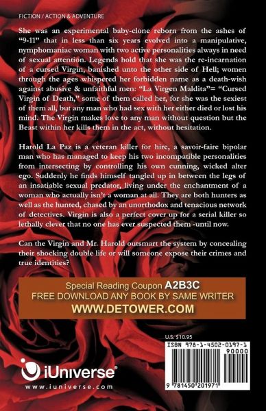 She was an experimental baby-clone reborn from the ashes of "9-11" that in less than six years evolved into a manipulative, nymphomaniac woman with two active personalities always in need of sexual attention. Legends hold that she was the re-incarnation of a cursed Virgin, banished unto the other side of Hell; women through the ages whispered her forbidden name as a death-wish against abusive & unfaithful men: "La Virgen Maldita"= "Cursed Virgin of Death," some of them called her, for she was the sexiest of them all, but any man who had sex with her either died or lost his mind. The Virgin makes love to any man without question but the Beast within her kills them in the act, without hesitation. Harold La Paz is a veteran killer for hire, a savoir-faire bipolar man who has managed to keep his two incompatible personalities from intersecting by controlling his own cunning, wicked alter ego. Suddenly he finds himself tangled up in between the legs of an insatiable sexual predator, living under the enchantment of a woman who actually isn't a woman at all. They are both hunters as well as the hunted, chased by an unorthodox and tenacious network of detectives. Virgin is also a perfect cover up for a serial killer so lethally clever that no one has ever suspected them -until now. Can the Virgin and Mr. Harold outsmart the system by concealing their shocking double life or will someone expose their crimes and true identities?