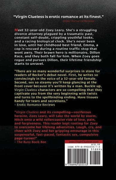 "The most entertaining romance novel of the year! The suspense & sex are spellbinding & delicious!" - Book Envy Reviews Meet 32-year-old Zoey Leary, a divorce attorney and secret hacker haunted by a traumatic past, crippling self-doubt, a ticking biological clock, and the kind of youthful looks that keep her from being taken seriously. She's never been in love-until her best friend, Emma, a tough-as-nails Connecticut State Trooper, is rescued during a routine traffic stop gone wrong. Their brawn hero is 18-year-old millionaire Dillon Race-and they both fall for him. When Zoey goes rogue and crosses a forbidden line, her lifelong friendship begins to unravel. Virgin Clueless is a provocative, high-stakes, slow-burn romance novel packed with obsession, suspense, forbidden lust, betrayal, and an unexplainable bond no one sees coming. "There are so many wonderful surprises in store for readers of Becker's debut novel. First, he writes so convincingly in the voice of a 32-year-old female. Second, sex so steamy you'll keep glancing at the front cover because it's written by a man. Buckle up, Virgin Clueless characters are so compelling that they captivate you from the very beginning with twists and turns to the spellbinding ending. Have tissues handy for tears and secretions." - Erotic Romance Reviews"An addictive-unputdownable erotic thriller!" - The Busy Book Bee "Virgin Clueless and its compelling-vociferous heroine, Zoey Leary, will take the world by storm. Hitch onto a wild rollercoaster ride of love, pain, and forgiveness. This reader kept rooting for Zoey to overcome her lifelong adversities. Laugh, cry, and cheer with Zoey and her gripping entourage in this suspenseful, fast-paced, fantastic sex, compulsive page-turner!" - The Busy Book Bee"Virgin Clueless is erotic romance at its finest." - Erotic Romance Reviews "Virgin Clueless is erotic romance at its finest." - Erotic Romance Reviews "I'm a romance book addict devouring juicy novels for decades. I probably read over a thousand novels, and hands down Scott's thread beats the pants off of all of them." - Skyler Rose "An extraordinary writer, Becker's high-octane page-turner-a hidden gem is easily worth double the asking price-a romance novel for ages!" - Book Envy Reviews