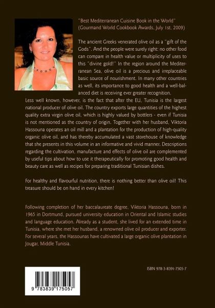 "Best Mediterranean Cuisine Book in the World" (Gourmand World Cookbook Awards, July 1st, 2009)The ancient Greeks venerated olive oil as a "gift of the Gods." And the people were surely right: no other food can compare in health value or multiplicity of uses to this "divine gold!" In the region around the Mediterranean Sea, olive oil is a precious and irreplaceable basic source of nourishment. In many other countries as well, its importance to good health and a well-balanced diet is receiving ever greater recognition. Less well known, however, is the fact that after the EU, Tunisia is the largest national producer of olive oil. The country exports large quantities of the highest quality extra virgin olive oil, which is highly valued by bottlers-even if Tunisia is not mentioned as the country of origin. Together with her husband, Viktoria Hassouna operates an oil mill and a plantation for the production of high-quality organic olive oil, and has thereby accumulated a vast storehouse of knowledge that she presents in this volume in an informative and vivid manner. Descriptions regarding the cultivation, manufacture and effects of olive oil are complemented by useful tips about how to use it therapeutically for promoting good health and beauty care as well as recipes for preparing traditional Tunisian dishes. For healthy and flavourful nutrition, there is nothing better than olive oil! This treasure should be on hand in every kitchen!