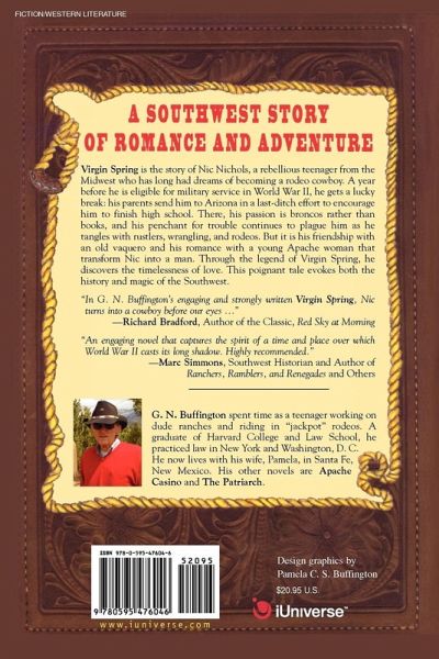 Virgin Spring is the story of Nic Nichols, a rebellious teenager from the Midwest who has long had dreams of becoming a rodeo cowboy. A year before he is eligible for military service in World War II, he gets a lucky break: his parents send him to Arizona in a last-ditch effort to encourage him to finish high school. There, his passion is broncos rather than books, and his penchant for trouble continues to plague him as he tangles with rustlers, wrangling, and rodeos. But it is his friendship with an old vaquero and his romance with a young Apache woman that transform Nic into a man. Through the legend of Virgin Spring, he discovers the timelessness of love. This poignant tale evokes both the history and magic of the Southwest. "In G. N. Buffington's engaging and strongly written Virgin Spring, Nic turns into a cowboy before our eyes ." -Richard Bradford, Author of the Classic, Red Sky at Morning "An engaging novel that captures the spirit of a time and place over which World War II casts its long shadow. Highly recommended." -Marc Simmons, Southwest Historian and Author of Ranchers, Ramblers, and Renegades and Others