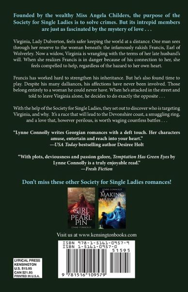 Founded by the wealthy Miss Angela Childers, the purpose of the Society for Single Ladies is to solve crimes. But its intrepid members are just as fascinated by the mystery of love . . . Virginia, Lady Dulverton, feels safer keeping the world at a distance. One man sees through her reserve to the woman beneath: the infamously rakish Francis, Earl of Wolverley. Now a widow, Virginia is wrangling with the terms of her late husband’s will. When she realizes Francis is in danger because of his connection to her, she feels compelled to help, regardless of the hazard to her own heart. Francis has worked hard to strengthen his inheritance. But he’s also found time to play. Despite his many dalliances, his affections have never been involved. Those belong entirely to a woman he could never have. When he’s attacked in the street and told to leave Virginia alone, he decides to do exactly the opposite . . . With the help of the Society for Single Ladies, they set out to discover who is targeting Virginia, and why. It’s a race that will lead to the Devonshire coast, a smuggling ring, and a love that, however perilous, is worth waging countless battles . . . "Lynne Connolly writes Georgian romances with a deft touch. Her characters amuse, entertain and reach into your heart." —USA Today bestselling authorDesiree Holt "With plots, deviousness and passion galore, Temptation Has Green Eyes by Lynne Connolly is a truly enjoyable read." —Fresh Fiction