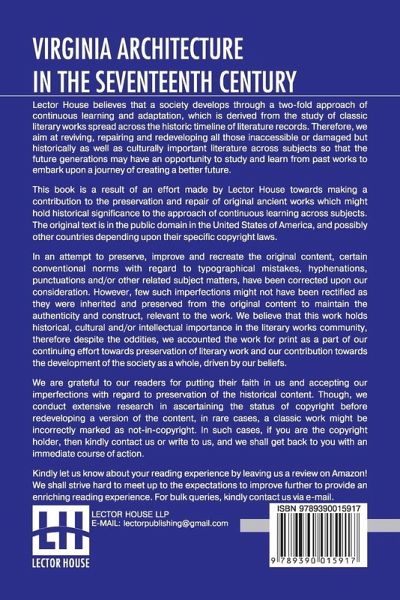 Virginia Architecture In The Seventeenth Century This book is a result of an effort made by us towards making a contribution to the preservation and repair of original classic literature. In an attempt to preserve, improve and recreate the original content, we have worked towards: 1. Type-setting & Reformatting: The complete work has been re-designed via professional layout, formatting and type-setting tools to re-create the same edition with rich typography, graphics, high quality images, and table elements, giving our readers the feel of holding a 'fresh and newly' reprinted and/or revised edition, as opposed to other scanned & printed (Optical Character Recognition - OCR) reproductions. 2. Correction of imperfections: As the work was re-created from the scratch, therefore, it was vetted to rectify certain conventional norms with regard to typographical mistakes, hyphenations, punctuations, blurred images, missing content/pages, and/or other related subject matters, upon our consideration. Every attempt was made to rectify the imperfections related to omitted constructs in the original edition via other references. However, a few of such imperfections which could not be rectified due to intentional\unintentional omission of content in the original edition, were inherited and preserved from the original work to maintain the authenticity and construct, relevant to the work. We believe that this work holds historical, cultural and/or intellectual importance in the literary works community, therefore despite the oddities, we accounted the work for print as a part of our continuing effort towards preservation of literary work and our contribution towards the development of the society as a whole, driven by our beliefs. We are grateful to our readers for putting their faith in us and accepting our imperfections with regard to preservation of the historical content. HAPPY READING!
