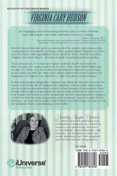 An engaging and enchanting journey into a world of letters that will inspire and edify all those who love writing. -Jerome Groopman, MD, Recanati Professor, Harvard Medical School, coauthor with Dr. Pamela Hartzband, "Your Medical Mind: How to Decide What is Right for You." Beverly Mayne Kienzle grew up surrounded by papers and manuscripts containing the remarkable writings of her grandmother Virginia Cary Hudson Cleveland, still unpublished at her death in 1954. Beverly's mother, Virginia Cleveland Mayne, devoted herself to publishing those works. That manuscript, O Ye Jigs and Juleps!, sold for $2.50 and made its first-of sixty-six-appearances on the New York Times Best Sellers list on May 27, 1962, and three other books followed. Kienzle now returns to her roots and tells the story her mother started but never finished, the biography of Virginia Cary Hudson, a "girl who grew up preaching." In this authoritative biography, Virginia Cary Hudson, Kienzle recounts the career and family life of Virginia Cary Hudson. With warmth and humor, she reveals her grandmother's incisive observations of humankind, from simple folk to big-time gamblers, in places from Kentucky to Havana and Las Vegas. The letters and the scrapbook Beverly's grandmother completed for her, with its charming poems and drawings, appear in print for the first time, as does the narrative that Beverly's mother began in order to tell the poignant story of publishing a best seller.