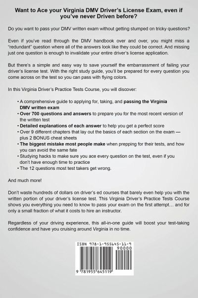 Want to Ace your Virginia DMV Driver's License Exam, even if you've never Driven before? Are you afraid of failing your driver's license test? Or have you failed the test before and still aren't sure what the right answers are? Do you want to pass your DMV written exam without getting stumped on tricky questions? You might've heard that the driver's license test in Virginia is immensely difficult, regardless of your driving experience. Plenty of out-of-staters will tell you horror stories of how they failed terribly on the written exam... despite years of driving under their belts. And it's even scarier if you've never been behind the wheel. Because as excited as you may be to start driving on your own... you only get a few tries to pass the written test... before you're forced to begin the whole application process all over again. Even if you've read through the DMV handbook over and over, you might miss a "redundant" question where all of the answers look like they could be correct. And missing just one question is enough to invalidate your entire driver's license application. But there's a simple and easy way to save yourself the embarrassment of failing your driver's license test. With the right study guide, you'll be prepared for every question you come across on the test so you can pass with flying colors. In this Virginia Driver's Practice Tests Course, you will discover: * A comprehensive guide to applying for, taking, and passing the Virginia DMV written exam * Over 700 questions and answers to prepare you for the most recent version of the written test * Detailed explanations of each answer to help you get a perfect score * Over 9 different chapters that lay out the basics of each section on the exam - plus 2 BONUS cheat sheets * The biggest mistake most people make when prepping for their tests, and how you can avoid the same fate * 56 tips and tricks to get you ready for both the written exam and the road test * Studying hacks to make sure you ace every question on the test, even if you don't have enough time to practice * The 12 questions most test takers get wrong - answer these the right way if you don't want to fail And much more! Don't waste hundreds or even thousands of dollars on driver's ed courses that barely even help you with the written portion of your driver's license test. This Virginia Driver's Practice Tests Course shows you everything you need to know to pass your exam on the first attempt... and for only a small fraction of what it costs to hire an instructor. Regardless of your driving experience, this all-in-one guide will boost your test-taking confidence and have you cruising around Virginia in no time. You could keep sitting at home worrying about whether or not you're going to have to retake the test... or you can master all the essential road rules, skills, and practices and get one step closer to obtaining your driver's license. If you want to Pass your DMV written exam once and for all, then scroll up and click the