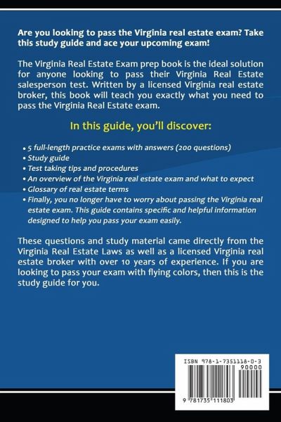 Are you looking to pass the Virginia real estate exam? Take this study guide and ace your upcoming exam! The Virginia Real Estate Exam prep book is the ideal solution for anyone looking to pass their Virginia Real Estate salesperson test. Written by a licensed Virginia real estate broker, this book will teach you exactly what you need to pass the Virginia Real Estate exam. In this guide, you'll discover: · 5 full-length practice exams with answers (200 questions)· Study guide· An overview of the Virginia real estate exam and what to expect· Glossary of real estate terms Finally, you no longer have to worry about passing the Virginia real estate exam. This guide contains specific and helpful information designed to help you pass your exam easily. Decide to work smarter and not harder. You can go through this concise book in an afternoon and get a jump start on your real estate exam.
