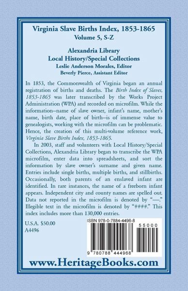In 1853, the Commonwealth of Virginia began an annual registration of births and deaths. The Birth Index of Slaves, 1853-1865 was later transcribed by the Works Project Administration (WPA) and recorded on microfilm. While the information-name of slave owner, infant's name, mother's name, birth date, place of birth-is of immense value to genealogists, working with the microfilm can be problematic. Hence, the creation of this multi-volume reference work, Virginia Slave Births Index, 1853-1865. In 2003, staff and volunteers with Local History/Special Collections, Alexandria Library began to transcribe the WPA microfilm, enter data into spreadsheets, and sort the information by slave owner's surname and given name. Entries include single births, multiple births, and stillbirths. Occasionally, both parents of an enslaved infant are identified. In rare instances, the name of a freeborn infant appears. Independent city and county names are spelled out. Data not reported in the microfilm is denoted by "----." Illegible text in the microfilm is denoted by "####." This index includes more than 130,000 entries.