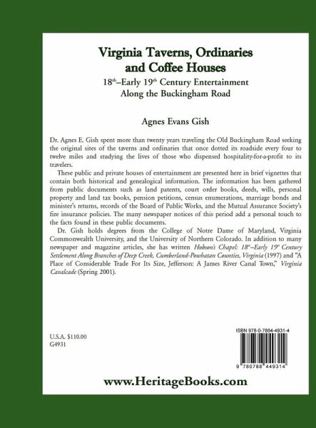 Dr. Agnes E. Gish spent more than twenty years traveling the Old Buckingham Road seeking the original sites of the taverns and ordinaries that once dotted its roadside every four to twelve miles and studying the lives of those who dispensed hospitality-for-a-profit to its travelers. These public and private houses of entertainment are presented here in brief vignettes that contain both historical and genealogical information. The information has been gathered from public documents such as land patents, court order books, deeds, wills, personal property and land tax books, pension petitions, census enumerations, marriage bonds and minister's returns, records of the Board of Public Works, and the Mutual Assurance Society's fire insurance policies. The many newspaper notices of this period add a personal touch to the facts found in these public documents.