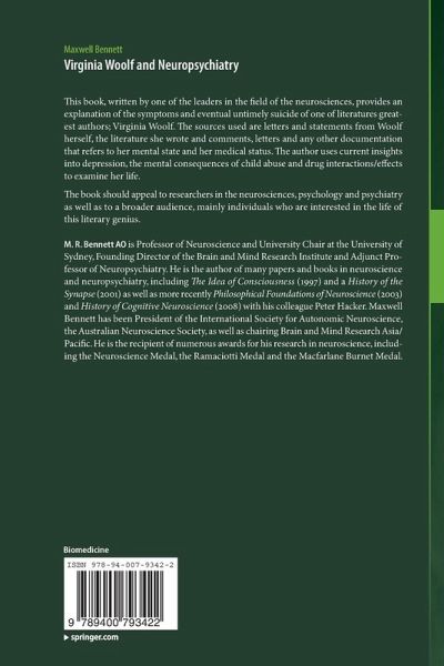 This book, written by one of the leaders in the field of the neurosciences, will give an explanation of the symptoms and eventual untimely suicide of one of literatures greatest authors; Virginia Woolf. The sources used are letters and statements from Woolf herself, the literature she wrote and comments, letters and any other documentation that referred to her mental state and her medical status. The author will use current insight into depression, the mental consequences of child abuse and drug interactions/effects to illustrate this case study. The book should appeal to researchers in the neurosciences, psychology and psychiatry as well as to a broader audience, mainly individuals who are interested in the (external and internal) forces that drove Woolf to write her material.