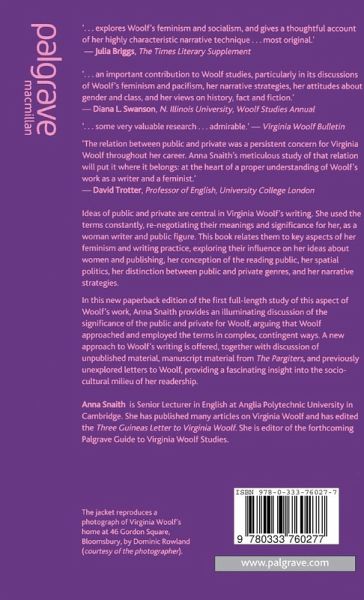 In Virginia Woolf: Public and Private Negotiations, Anna Snaith explores the centrality of ideas of public and private in Woolf's life and writing. The book offers a fresh understanding of Woolf's feminism, her narrative techniques, her attitudes to publication, and her role in public debate. It draws on new manuscript material and previously unexplored letters to Woolf from her reading public.