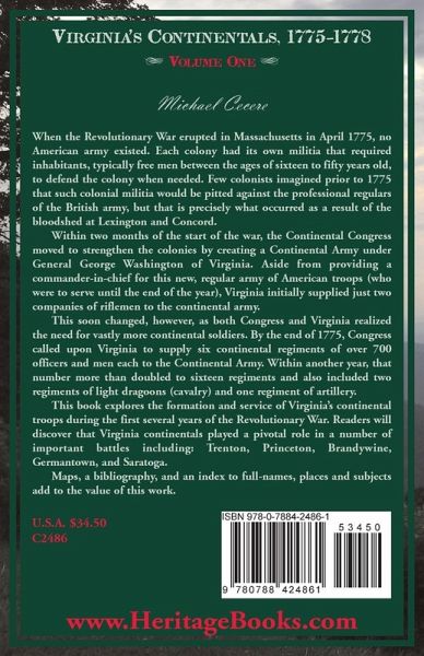 When the Revolutionary War erupted in Massachusetts in April 1775, no American army existed. Each colony had its own militia that required inhabitants, typically free men between the ages of sixteen to fifty years old, to defend the colony when needed. Few colonists imagined prior to 1775 that such colonial militia would be pitted against the professional regulars of the British army, but that is precisely what occurred as a result of the bloodshed at Lexington and Concord. Within two months of the start of the war, the Continental Congress moved to strengthen the colonies by creating a Continental Army under General George Washington of Virginia. Aside from providing a commander-in-chief for this new, regular army of American troops (who were to serve until the end of the year), Virginia initially supplied just two companies of riflemen to the continental army. This soon changed, however, as both Congress and Virginia realized the need for vastly more continental soldiers. By the end of 1775, Congress called upon Virginia to supply six continental regiments of over 700 officers and men each to the Continental Army. Within another year, that number more than doubled to sixteen regiments and also included two regiments of light dragoons (cavalry) and one regiment of artillery. This book explores the formation and service of Virginia's continental troops during the first several years of the Revolutionary War. Readers will discover that Virginia continentals played a pivotal role in a number of important battles including: Trenton, Princeton, Brandywine, Germantown, and Saratoga. Maps, a bibliography, and an index to full-names, places and subjects add to the value of this work. 2022, 5¿x8¿, paper, index, 340 pp.