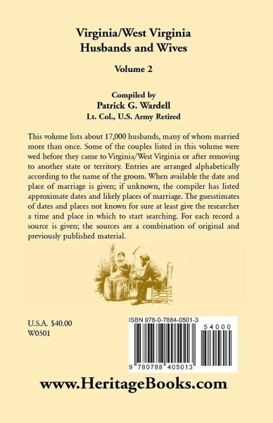 This volume lists about 17,000 husbands, many of whom married more than once. Some of the couples listed in this volume were wed before they came to Virginia/West Virginia or after removing to another state or territory. Entries are arranged alphabetically according to the name of the groom. When available the date and place of marriage is given; if unknown, the compiler has listed approximate dates and likely places of marriage. The guesstimates of dates and places not known for sure at least give the researcher a time and place in which to start searching. For each record a source is given; the sources are a combination of original and previously published material.