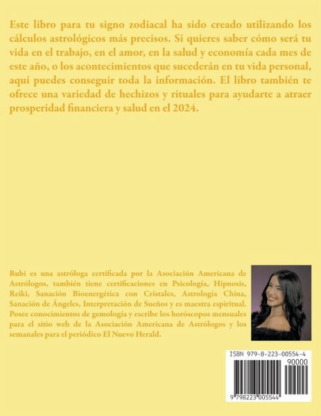 Este libro para tu signo zodiacal ha sido creado utilizando los cálculos astrológicos más precisos. Si quieres saber cómo será tu vida en el trabajo, en el amor, en la salud y economía cada mes de este año, o los acontecimientos que sucederán en tu vida personal, aquí puedes conseguir toda la información. El libro también te ofrece una variedad de hechizos y rituales para ayudarte a atraer prosperidad financiera y salud en el 2024.