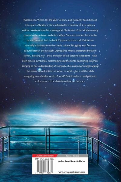 Welcome to Viridia. It's the 26th Century, and humanity has advanced into space. Alandra, a clone educated in a mimicry of 21st century culture, awakens from her cloning pod. She is part of the Viridian colony created with a mission: to build a Warp Gate and connect back to the human network hub in the Sol System and thus turn Viridia into humanity's farthest-from-the-cradle colony. Struggling with her own cultural latency, she is caught unprepared when a disastrous bioclasm strikes, infecting her - and a minority of the colony's inhabitants - with alien genetic symbiotes, metamorphosing them into something inhuman. Clinging to her understanding of humanity, she must now struggle against the preconceived notions of who - or what - she is, all the while navigating an unfamiliar world. A world that is under no obligation to make sense to the aliens from beyond the stars.