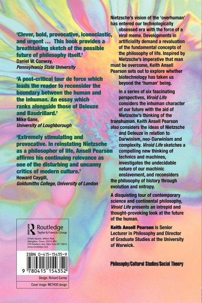 Nietzsche's vision of the 'overman' continues to haunt the postmodern imagination. His call that 'man is something that must be overcome' can no longer be seen as simple rhetoric. Our experiences of the hybrid realities of artificial life have made the 'transhuman' a figure that looks over us all. Inspired by this vision, Keith Ansell Pearson sets out to examine if evolution is 'out of control' and machines are taking over. In a series of six fascinating perspectives, he links Nietzsche's thought with the issues at stake in contemporary conceptions of evolution from the biological to the technological. Viroid Life; Perspectives on Nietzsche and the Transhuman Condition considers the hybrid, 'inhuman' character of our future with the aid of Nietzsche's philosophy. Keith Ansell Pearson contrasts Nietzsche and Darwin before introducing the more recent figures such as Giles Deleuze and Guy Debord to sketch a new thinking of technics and machines and stress the ambiguous character of our 'machine enslavement'.