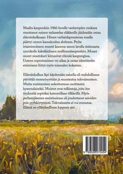 Maalta kaupunkiin 1960-luvulla vanhempien mukana muuttanut nainen tarkastelee eläkkeelle jäädessään omaa elämänkulkuaan. Hänen varhaislapsuutensa maalla päättyi ennen kansakoulun aloitusta. Perhe irtaimistoineen muutti kuorma-auton lavalla sisämaasta rannikolle kaksikieliseen teollisuuskaupunkiin. Monet suuret muutokset leimasivat elämää kaupungissa. Uuteen sopeutuminen vei aikaa ja oman identiteetin etsimiseen liittyi myös toiseuden kokemus. Elämänkulkua läpi käydessään naisella oli mahdollisuus päivittää menneisyyttään ja suuntautua tulevaisuuteen. Mutta muistamisen aukottomuus osoittautui kyseenalaiseksi. Muistot ovat tulkintoja, joita itse täydentää sopiviksi katsomillaan tilkkeillä. Myös perheenjäsenen muistisairaus oli jouduttanut asioiden pois pyyhkiytymistä. Tulevaisuutta ei voi ennustaa. Elämä on yllätyksellinen loppuun asti.