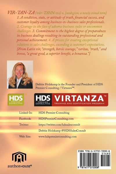 VIR-TAN-ZA (vûr-TAHN-z¿) n. [neologism, a newly coined term] 1. A condition, state, or attitude of truth, financial success, and customer loyalty among business-to-business sales professionals. 2. Courage in the face of adverse business cycles or uncommon challenges. 3. Commitment to the highest degree of preparedness in business dealings resulting in outstanding professional and personal achievement. 4. A process for creating exceptional solutions to sales challenges, exceeding a customer's expectations. [From Latin vir, "strength, heroic courage," veritas, "truth," and bonus, "a great good, a superior benefit, a bonanza."]